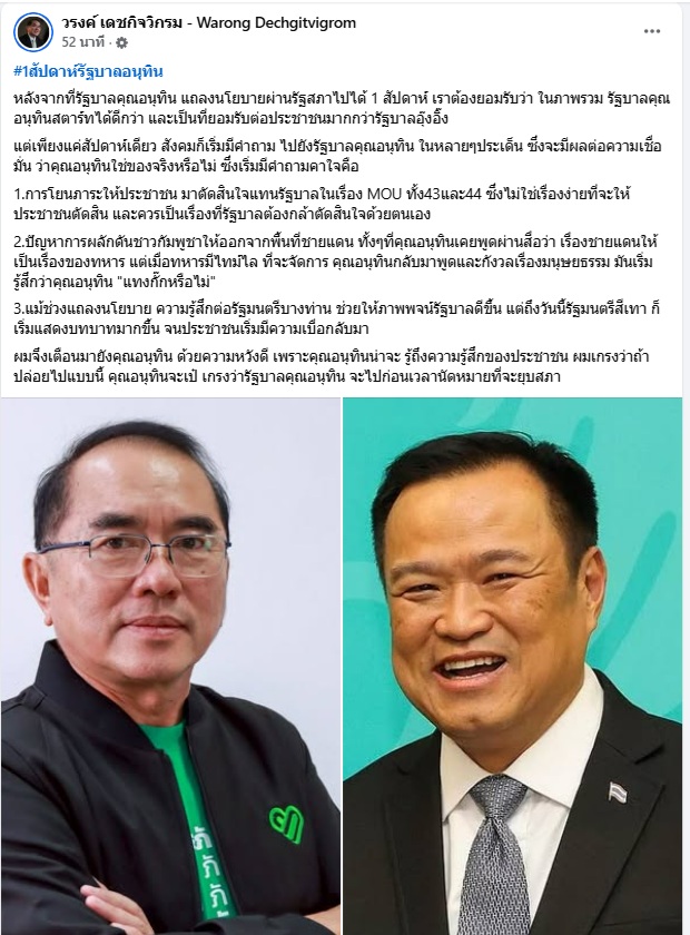 5 ตุลาคม 2568 นพ.วรงค์ เดชกิจวิกรม ประธานพรรคไทยภักดี โพสต์เฟซบุ๊ก “วรงค์ เดชกิจวิกรม - Warong Dechgitvigrom” หัวข้อ“1สัปดาห์รัฐบาลอนุทิน” ระบุว่า...