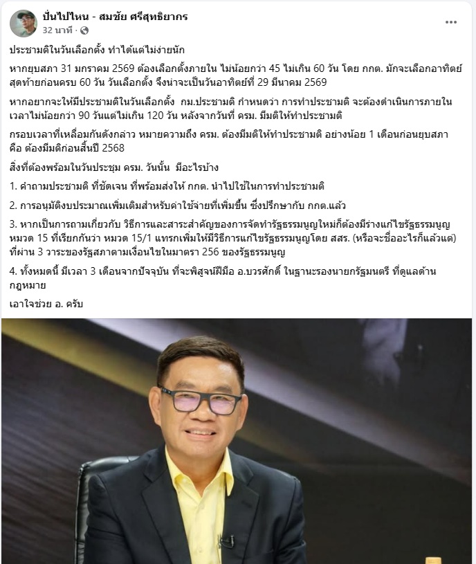 5 ตุลาคม 2568 นายสมชัย ศรีสุทธิยากร อดีตกรรมการการเลือกตั้ง (อดีต กกต.) โพสต์เฟซบุ๊ก “ปั่นไปไหน – สมชัย ศรีสุทธิยากร” หัวข้อ “ประชามติในวันเลือกตั้ง ทำได้แต่ไม่ง่ายนัก” ระบุว่า...