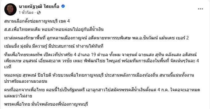 5 ตุลาคม 2568 นายณัฐวุฒิ ใสยเกื้อ แกนนำพรรคเพื่อไทย โพสต์เฟซบุ๊ก ระบุว่า “สนามเลือกตั้งซ่อมกาญจนบุรี เขต 4”