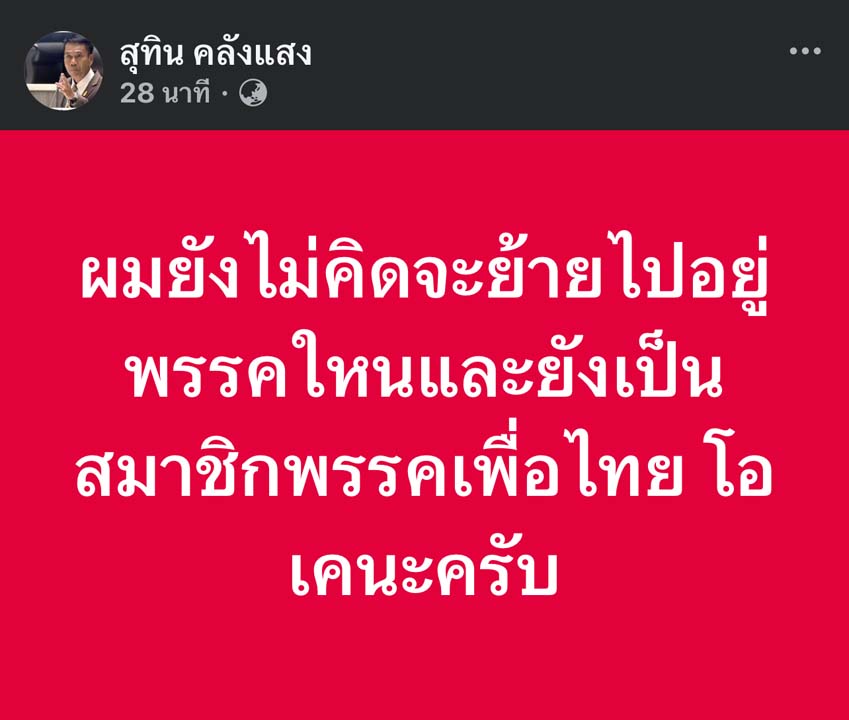 ทั้งนี้ นายสุทิน ได้โพสต์ข้อความผ่านเฟซบุ๊ก ว่า “ผมยังไม่คิดจะย้ายไปอยู่พรรคไหน และยังเป็นสมาชิกพรรคเพื่อไทย โอเคนะครับ”