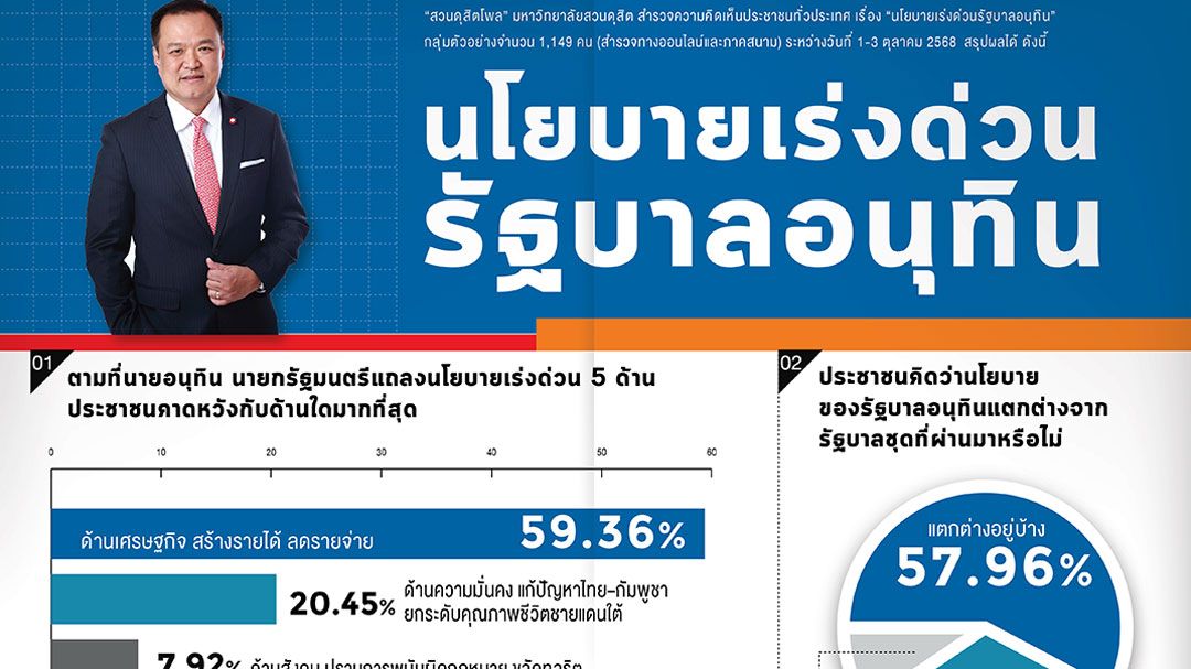 ขณะเดียวกัน“สวนดุสิตโพล” มหาวิทยาลัยสวนดุสิต สำรวจความคิดเห็นประชาชนทั่วประเทศ เรื่อง“นโยบายเร่งด่วนรัฐบาลอนุทิน”กลุ่มตัวอย่าง จำนวน 1,149 คน (สำรวจทางออนไลน์และภาคสนาม) ระหว่างวันที่ 1-3 ตุลาคม 2568