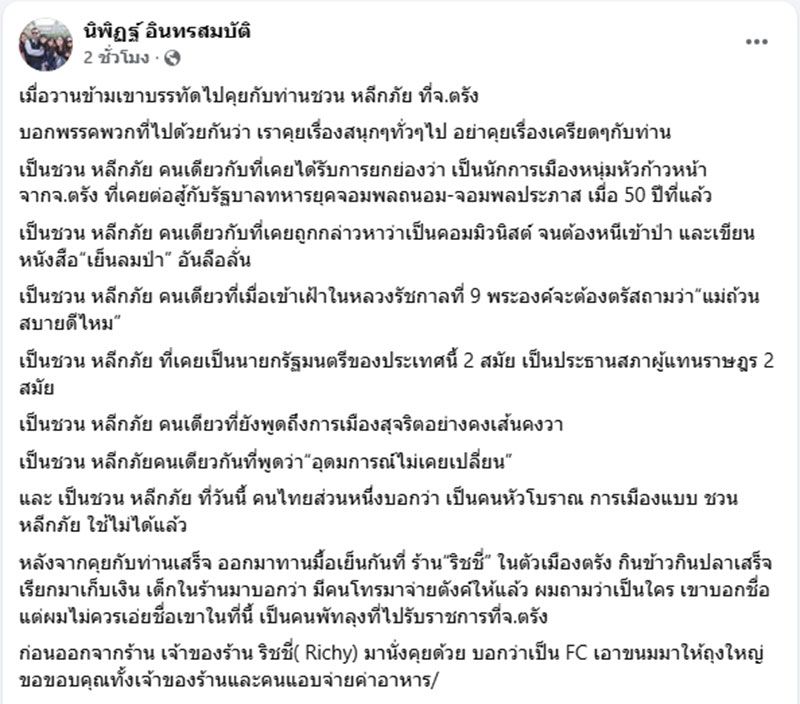 วันที่ 6 ตุลาคม 2568 นายนิพิฏฐ์ อินทรสมบัติ อดีตรองหัวหน้าพรรคประชาธิปัตย์ โพสต์ข้อความผ่านเฟซบุ๊กว่า เมื่อวานข้ามเขาบรรทัดไปคุยกับท่านชวน หลีกภัย ที่จังหวัดตรัง บอกพรรคพวกที่ไปด้วยกันว่า เราคุยเรื่องสนุกๆ ทั่วๆ ไป อย่าคุยเรื่องเครียดๆ กับท่าน