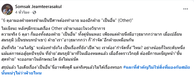 เช้าวันที่ 6 ตุลาคม 2568 ครบรอบ 49 ปี เหตุการณ์วันที่ 6 ตุลาคม 2519 นายสมศักดิ์ เจียมธีรสกุล แกนนำนักศึกษาและเป็นโฆษกเวทีในที่ชุมนุมในมหาวิทยาลัยธรรมศาสตร์ ท่าพระจันทร์ ในวันที่ 6 ตุลาคม 2519 ซึ่งปัจจุบันลี้ภัยอยู่ที่ประเทศฝรั่งเศส ได้โพสต์เฟสบุ๊คระบุว่า “วันที่ 6 ตุลาคม 2519 เราไม่ได้เรียกร้องประชาธิปไตยนี่เป็นสิ่งที่เป็นหัวใจของ "6 ตุลา" เป้าหมายสูงสุดของเราคือคอมมิวนิสม์แบบเหมา ซึ่งปัจจุบันไม่มีใครเอา”