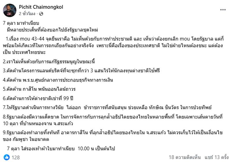 วันที่ 6 ตุลาคม 2568 นายพิชิต ไชยมงคล แกนนำเครือข่ายนักศึกษาประชาชนปฏิรูปประเทศไทย (คปท.) โพสต์เฟซบุ๊ก Pichit Chaimongkol ระบุว่า 7 ตุลา มาทำเนียบ มีหลายประเด็นที่ต้องบอกไปยังรัฐบาลชุดใหม่