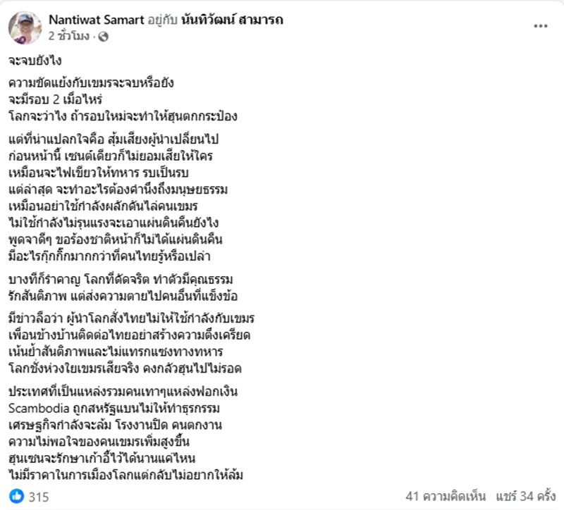 มีข่าวลือว่า ผู้นำโลกสั่งไทยไม่ให้ใช้กำลังกับเขมร เพื่อนข้างบ้านติดต่อไทยอย่าสร้างความตึงเครียด เน้นย้ำสันติภาพและไม่แทรกแซงทางทหาร โลกชั่งห่วงใยเขมรเสียจริง คงกลัวฮุนไปไม่รอด ประเทศที่เป็นแหล่งรวมคนเทาๆแหล่งฟอกเงิน Scambodia ถูกสหรัฐแบนไม่ให้ทำธุรกรรม เศรษฐกิจกำลังจะล้ม โรงงานปิด คนตกงาน ความไม่พอใจของคนเขมรเพิ่มสูงขึ้น ฮุนเซนจะรักษาเก้าอี้ไว้ได้นานแค่ไหน ไม่มีราคาในการเมืองโลกแต่กลับไม่อยากให้ล้ม