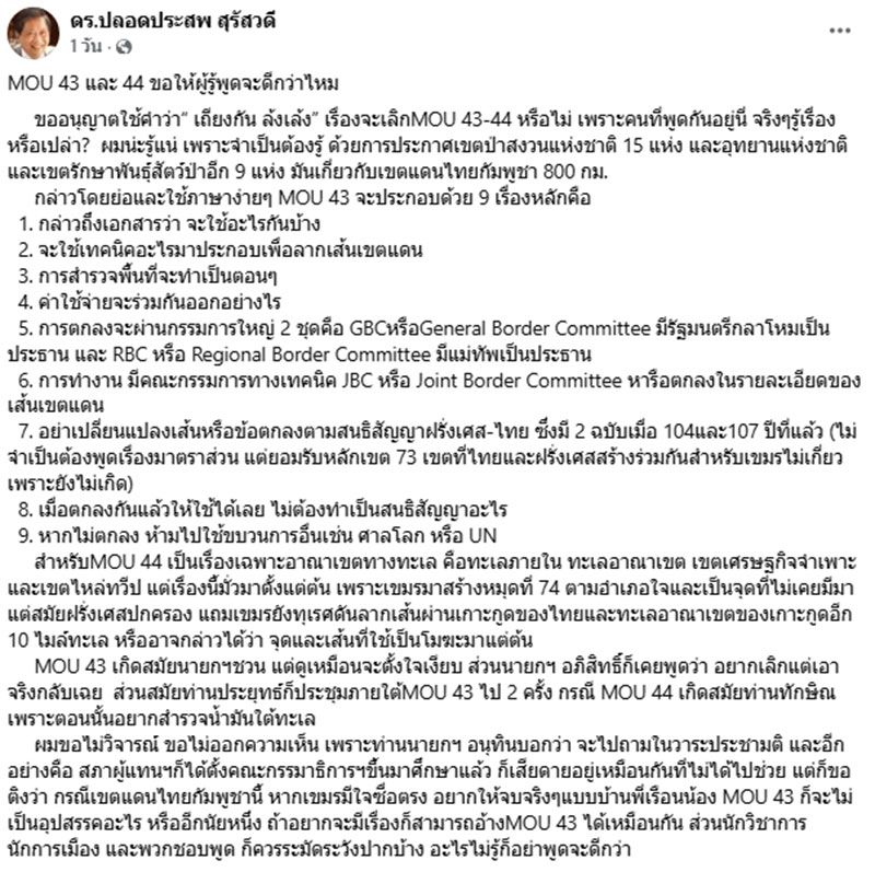 วันที่ 7 ตุลาคม 2568 ดร.ปลอดประสพ สุรัสวดี อดีตปลัดกระทรวงทรัพยากรธรรมชาติและสิ่งแวดล้อม และอดีตรองนายกรัฐมนตรี ได้โพสต์ข้อความลงบนเฟซบุ๊ก ระบุว่า MOU 43 และ 44 ขอให้ผู้รู้พูดจะดีกว่าไหม