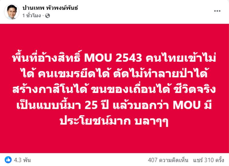 วันที่ 7 ตุลาคม 2568 นายปานเทพ พัวพงษ์พันธ์ ประธานมูลนิธิยามเฝ้าแผ่นดิน โพสต์ข้อความ ระบุว่า พื้นที่อ้างสิทธิ์ MOU 2543 คนไทยเข้าไม่ได้ คนเขมรยึดได้ ตัดไม้ทำลายป่าได้ สร้างกาสิโนได้ ขนของเถื่อนได้ ชีวิตจริงเป็นแบบนี้มา 25 ปี แล้วบอกว่า MOU มีประโยชน์มาก บลาๆๆ