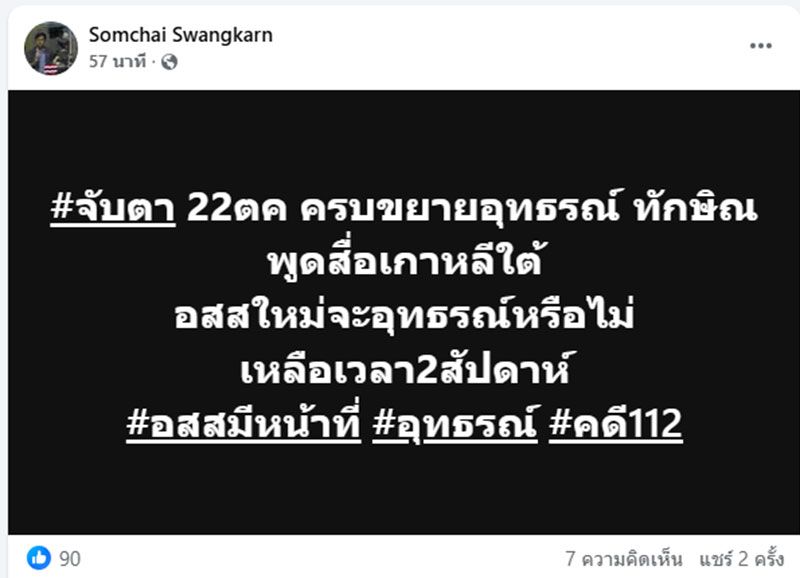 วันที่ 8 ตุลาคม 2568 นายสมชาย แสวงการ อดีตสมาชิกวุฒิสภา (สว.) โพสต์ข้อควาทผ่านเฟซบุ๊ก Somchai Swangkarn ระบุว่า #จับตา 22ตค ครบขยายอุทธรณ์ ทักษิณพูดสื่อเกาหลีใต้