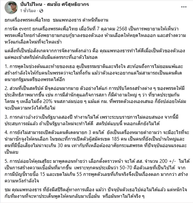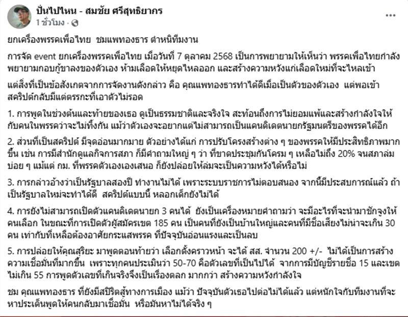 วันที่ 8 ตุลาคม 2568 นายสมชัย ศรีสุทธิยากร อดีตกรรมการการเลือกตั้ง (อดีต กกต.) โพสต์เฟซบุ๊ก “ปั่นไปไหน – สมชัย ศรีสุทธิยากร” ระบุว่า ยกเครื่องพรรคเพื่อไทย ชมแพทองธาร ตำหนิทีมงาน