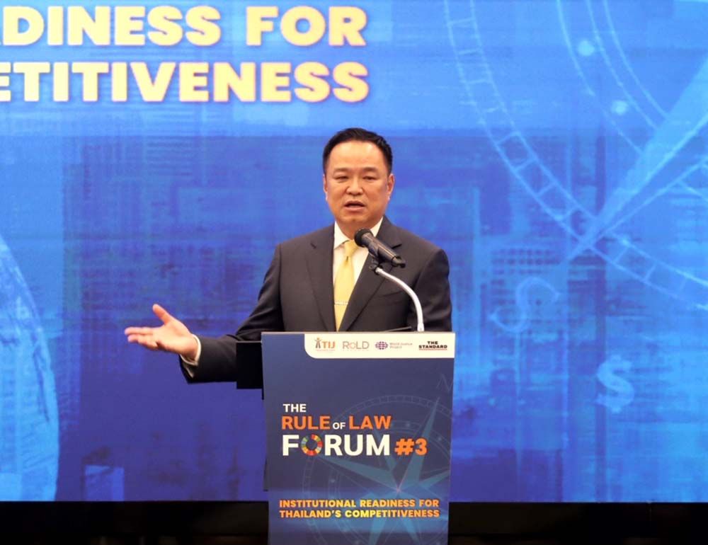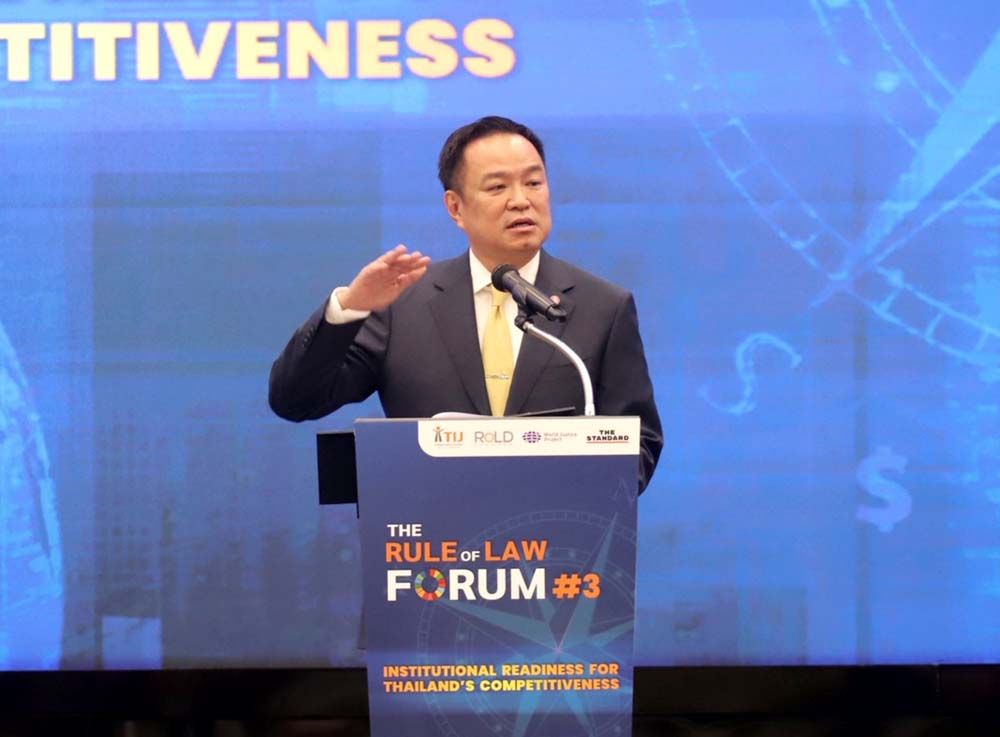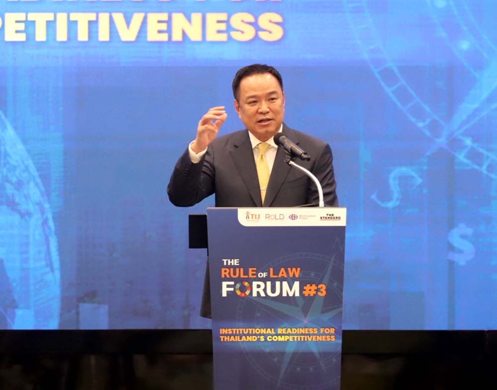 โดยนายกฯ กล่าวปาฐกถาพิเศษ ในหัวข้อ “ความพร้อมของกลไกเชิงสถาบันกับความสามารถในการแข่งขันของประเทศ” ตอนหนึ่งว่า ถือเป็นเวทีที่เปิดโอกาสให้พวกเราทุกคน ซึ่งเป็นผู้ที่มีส่วนร่วมในกระบวนการยุติธรรมของชาติได้มาทบทวนร่วมกัน และร่วมกันขับเคลื่อนให้หลักนิติธรรมกลายเป็นวาระแห่งชาติ และเป็นพื้นฐานของความสามารถในการแข่งขันของประเทศในอนาคตอันใกล้ เขาว่าคำว่าหลักนิติธรรม เป็นคำที่ถูกอ้างถึงบ่อยที่สุด และในขณะเดียวกันเป็นคำที่หลายคนใช้ประโยชน์ไปในทางที่ไม่ถูกต้อง โดยอ้างคำว่าหลักนิติธรรม ทั้งนี้ ตนต้องออกตัวก่อนว่าตนไม่ใช่นักกฏหมาย แต่เชื่อในเรื่องของ Rule Of Law หลายคนในที่นี้เคยทำงานร่วมกัน และเมื่อมีความเห็นแย้งเมื่อไร ถ้ามีคนที่อธิบายกับตนได้ในเรื่องของ Law ตนก็จะเชื่อในสิ่งนั้นยึดถือและเชื่อมั่นในกฎหมายในแนวคิดนี้มาโดยตลอดและเชื่อว่าทำให้ความคิดนี้ของตนอยู่รอด และประสบความสำเร็จพอสมควรไม่ว่าจะในสมัยเป็นนักธุรกิจกระทั่งมารับใช้บ้านเมืองในฐานะที่เป็นนักการเมือง และเป็นรัฐมนตรีที่ต้องมาบริหารราชการแผ่นดิน พื้นหลังตนเป็นวิศวกร นั่นคือการวางรากฐานที่มั่นคง ไม่ว่าจะเป็นการก่อสร้างอาคารโครงสร้างต่างๆ ที่ตนถนัด หรือการก่อตั้งองค์กรใดๆหรือการพัฒนาใดๆตนจะความสำคัญของเรื่องรากฐานที่มั่นคงก่อนเสมอ และในความเป็นวิศวกรนั้น ตนเชื่อว่าหลักความยุติธรรม เป็นเสมือนเสาเข็มที่สำคัญของทุกสังคม เพราะพวกเราทุกคน