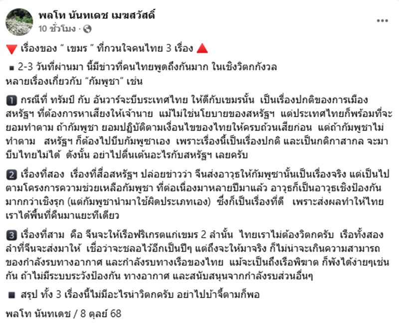 วันที่ 9 ตุลาคม 2568 พล.ท.นันทเดช เมฆสวัสดิ์ อดีตหัวหน้าศูนย์ปฏิบัติการพิเศษ ศูนย์รักษาความปลอดภัยแห่งชาติ (ศรภ.) โพสต์ข้อความลงบนเฟซบุ๊ก ระบุว่าเรื่องของ “ เขมร ” ที่กวนใจคนไทย 3 เรื่อง