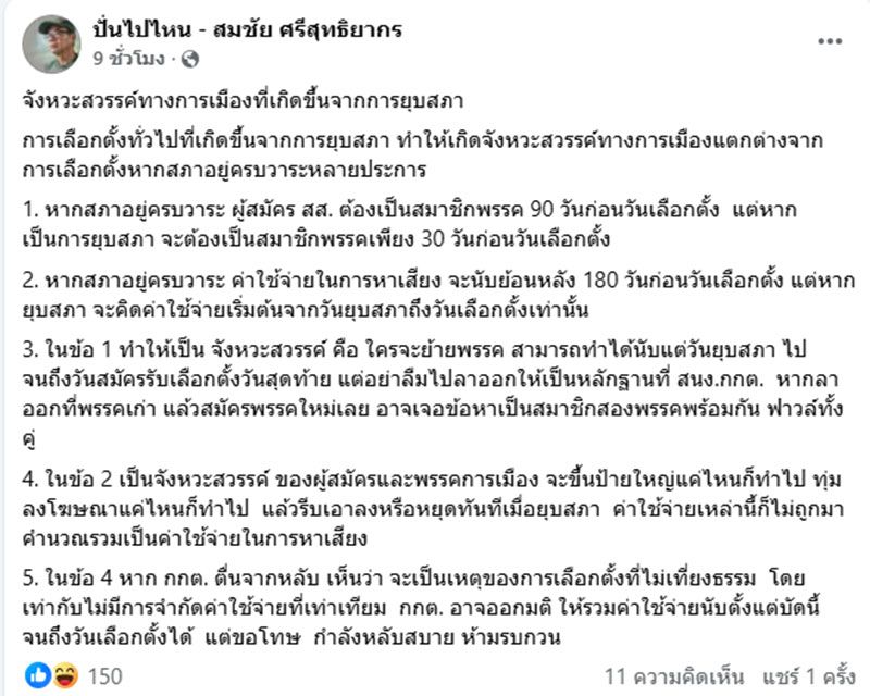 4.ในข้อ 2 เป็นจังหวะสวรรค์ ของผู้สมัครและพรรคการเมือง จะขึ้นป้ายใหญ่แค่ไหนก็ทำไป ทุ่มลงโฆษณาแค่ไหนก็ทำไป แล้วรีบเอาลงหรือหยุดทันทีเมื่อยุบสภา ค่าใช้จ่ายเหล่านี้ก็ไม่ถูกมาคำนวณรวมเป็นค่าใช้จ่ายในการหาเสียง