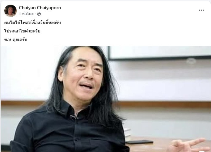 ล่าสุด ศ.ดร.ไชยันต์ โพสต์ปฏิเสธว่าไม่ได้โพสต์ข้อความตามที่เป็นข่าวแต่อย่างไร ระบุว่า “ผมไม่ได้โพสต์เรื่องจีนนี้นะครับ โปรดแก้ไขด้วยครับ ขอบคุณครับ”