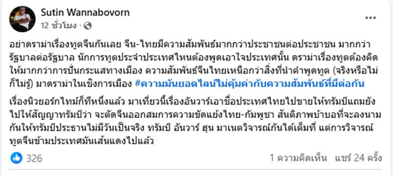 ล่าสุด นายสุทิน วรรณบวร อดีตผู้สื่อข่าวสำนักข่าวต่างประเทศ โพสต์ผ่านเฟซบุ๊ก Sutin Wannabovorn ระบุข้อความว่า อย่าดราม่าเรื่องทูตจีนกันเลย จีน-ไทยมีความสัมพันธ์มากกว่าประชาชนต่อประชาชน มากกว่ารัฐบาลต่อรัฐบาล นักการทูตประจำประเทศไหนต้องพูดเอาใจประเทศนั้น ดราม่าเรื่องทูตต้องคิดให้มากกว่าการปั่นกระแสทางเมือง ความสัมพันธ์จีนไทยเหนือกว่าสิ่งที่นำคำพูดทูต (จริงหรือไม่ก็ไม่รู้) มาดราม่าในเชิงการเมือง #ความมันยอดไลน์ไม่คุ้มค่ากับความสัมพันธ์ที่มีต่อกัน