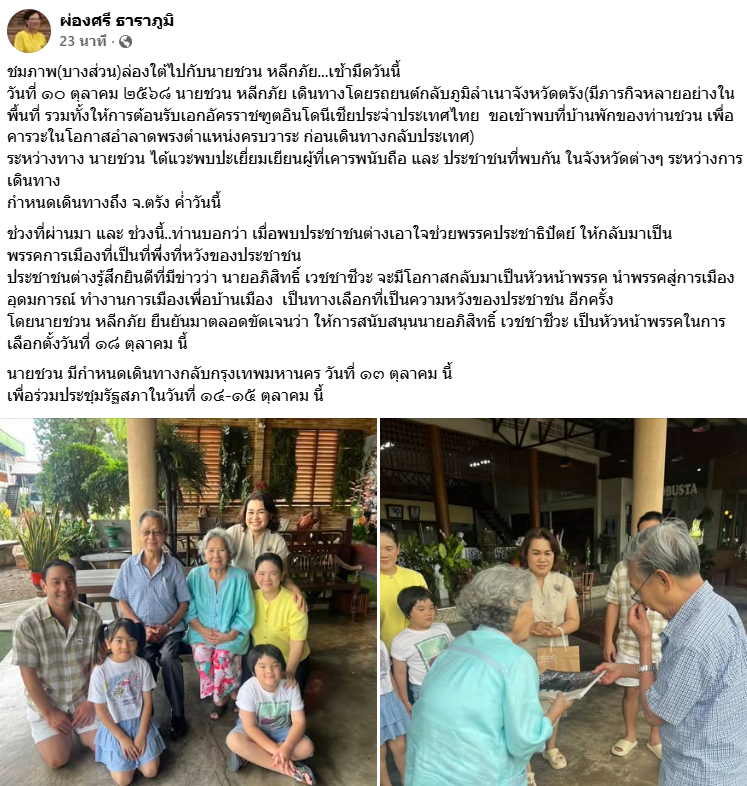 10 ต.ค. 68 นางสาวผ่องศรี ธาราภูมิ อดีต สส.ลพบุรี อดีตนายทะเบียน พรรคประชาธิปัตย์ โพสต์ภาพนายชวน หลีกภัย สส.บัญชีรายชื่อพรรคประชาธิปัตย์ อดีตประธานรัฐสภา และอดีตประธานสภาฯ พร้อมข้อความระบุว่า "ชมภาพ (บางส่วน) ล่องใต้ไปกับ นายชวน หลีกภัย...เช้ามืดวันนี้