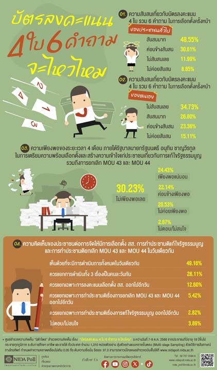 เมื่อถามถึงความสับสนเกี่ยวกับบัตรลงคะแนน 4 ใบ รวม 6 คำถาม (บัตรเลือก สส. ระบบเขตเลือกตั้งหนึ่งใบ; บัตรเลือก สส. ระบบบัญชีรายชื่อหนึ่งใบ; บัตรลงคะแนนประชามติเรื่องการแก้ไขรัฐธรรมนูญหนึ่งใบ สองข้อ; บัตรลงคะแนนประชามติเรื่องการยกเลิก MOU 43 และ MOU 44 หนึ่งใบ สองข้อ) ในการเลือกตั้งครั้งหน้าของประชาชนทั่วไป พบว่า