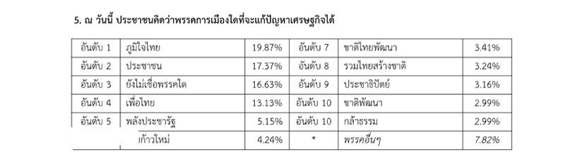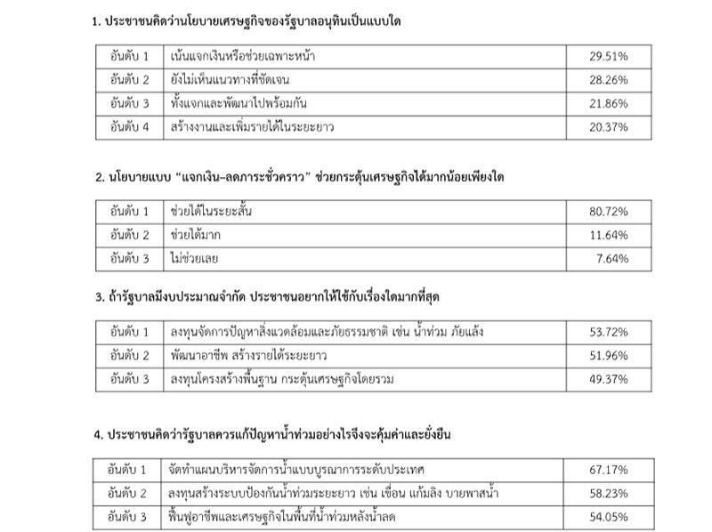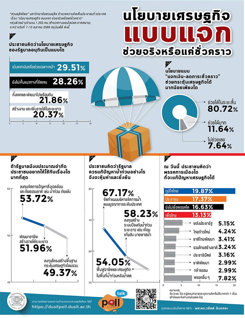 โดยมองว่านโยบายแบบ “แจกเงิน–ลดภาระชั่วคราว” ช่วยกระตุ้นเศรษฐกิจได้ในระยะสั้น ร้อยละ 80.72ถ้ารัฐบาลมีงบประมาณจำกัด ประชาชนอยากให้ใช้กับเรื่องลงทุนจัดการปัญหาสิ่งแวดล้อมและภัยธรรมชาติ เช่น น้ำท่วมภัยแล้ง ร้อยละ53.72 ประเด็นเรื่องน้ำท่วมมองว่ารัฐบาลควรแก้ปัญหาด้วยการจัดทำแผนบริหารจัดการน้ำแบบบูรณาการระดับประเทศร้อยละ 67.17 ประเด็นสุดท้าย ณ วันนี้ กลุ่มตัวอย่างคิดว่าพรรคการเมืองที่จะแก้ปัญหาเศรษฐกิจได้ คือ พรรคภูมิใจไทยร้อยละ 19.87 รองลงมาคือ พรรคประชาชน ร้อยละ 17.37 และยังไม่เชื่อพรรคใด ร้อยละ 16.63