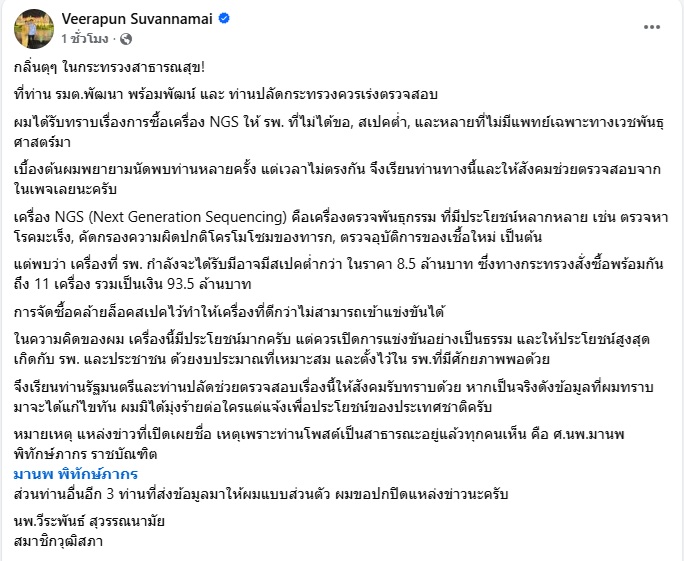 ผมได้รับทราบเรื่องการซื้อเครื่อง NGS ให้ รพ. ที่ไม่ได้ขอ , สเปคต่ำ และหลายที่ไม่มีแพทย์เฉพาะทางเวชพันธุศาสตร์มา