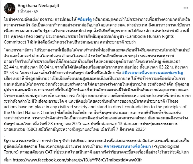 ในช่วงความขัดแย้ง/ สงคราม การปล่อยให้ #อินฟลู หรือกลุ่มบุคคลเข้าไปกระทำการเพื่อสร้างความกดดันหรือความหวาดกลัว ถือเป็นความท้าทายอย่างมากต่อรัฐบาลโดยเฉพาะ รมต. ต่างประเทศ ถึงแนวทางการแก้ปัญหาเพื่อหาทางออกร่วมกัน รัฐบาลไทยควรตระหนักว่าทุกสิ่งที่เกิดขึ้นถูกรายงานไปยังองค์การสหประชาชาติ วานนี้ (11 ตุลาคม) Keo Remy ประธานคณะกรรมาธิการสิทธิมนุษยชนกัมพูชา (Cambodia Human Rights Committee) ได้มีหนังสือถึงข้าหลวงใหญ่สิทธิมนุษยชน สหประชาชาติ ระบุว่า