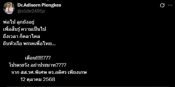 12 ตุลาคม 2568 นายอดิศร เพียงเกษ สส.บัญชีรายชื่อ พรรคเพื่อไทย โพสต์กลอนบน X ระบุว่า...