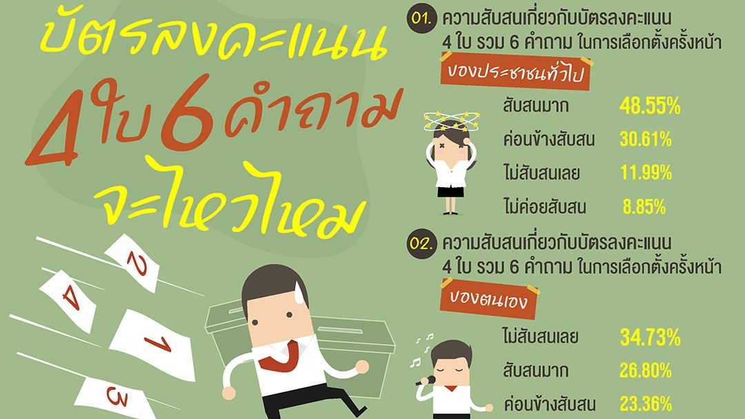 จากการสำรวจพบว่า เมื่อถามความสับสนเกี่ยวกับบัตรลงคะแนน 4 ใบ รวม 6 คำถาม (บัตรเลือก ส.ส.ระบบเขตเลือกตั้งหนึ่งใบ; บัตรเลือก ส.ส.ระบบบัญชีรายชื่อหนึ่งใบ; บัตรลงคะแนนประชามติเรื่องการแก้ไขรัฐธรรมนูญหนึ่งใบ สองข้อ; บัตรลงคะแนนประชามติเรื่องการยกเลิก MOU 43 และ MOU 44 หนึ่งใบ สองข้อ) ในการเลือกตั้งครั้งหน้าของประชาชนทั่วไป พบว่า ตัวอย่างร้อยละ 48.55 ระบุว่า สับสนมาก รองลงมา ร้อยละ 30.61 ระบุว่า ค่อนข้างสับสน ร้อยละ 11.99 ระบุว่า ไม่สับสนเลย และร้อยละ 8.85 ระบุว่า ไม่ค่อยสับสน ด้านความสับสนเกี่ยวกับบัตรลงคะแนน 4 ใบ รวม 6 คำถาม ในการเลือกตั้งครั้งหน้าของตนเอง พบว่า ตัวอย่างร้อยละ 34.73 ระบุว่า ไม่สับสนเลย รองลงมา ร้อยละ 26.80 ระบุว่า สับสนมาก ร้อยละ 23.36 ระบุว่า ค่อนข้างสับสน และร้อยละ 15.11 ระบุว่า ไม่ค่อยสับสน