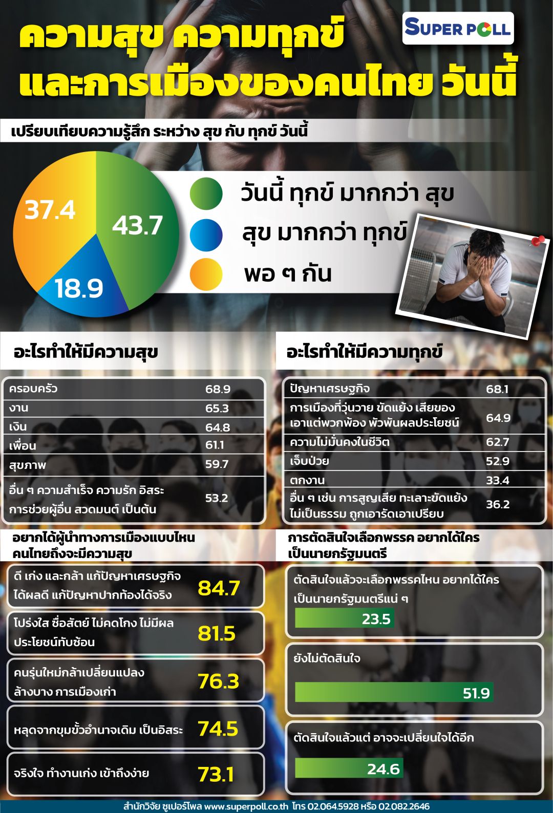 โพลเผยปัญหาเศรษฐกิจ-การเมือง ทำคนไทยทุกข์มากกว่าสุข เกินครึ่งยังไม่ตัดสินใจเลือกพรรคใด