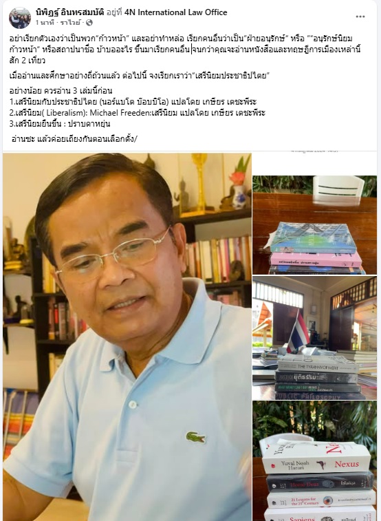 อย่าเรียกตัวเองว่าเป็นพวก “ก้าวหน้า” และอย่าทำหล่อ เรียกคนอื่นว่าเป็น “ฝ่ายอนุรักษ์” หรือ “อนุรักษ์นิยมก้าวหน้า” หรือสถาปนาชื่อบ้าบออะไรขึ้นมาเรียกคนอื่น จนกว่าคุณจะอ่านหนังสือและทฤษฎีการเมืองเหล่านี้สัก 2 เที่ยว