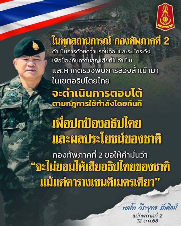 ในทุกสถานการณ์ กองทัพภาคที่ 2 ดำเนินการด้วยความรอบคอบและระมัดระวัง เพื่อป้องกันความสูญเสียที่ไม่จำเป็น และหากตรวจพบการล่วงล้ำเข้ามาในเขตอธิปไตยไทย จะดำเนินการตอบโต้ตามกฎการใช้กำลังโดยทันที เพื่อปกป้องอธิปไตยและผลประโยชน์ของชาติ