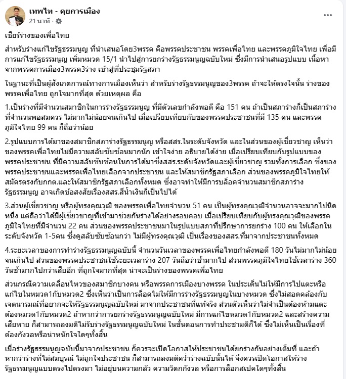 4.ระยะเวลาของการทำร่างรัฐธรรมนูญฉบับนี้ จำนวนวันเวลาของพรรคเพื่อไทยกำลังพอดี 180 วันไม่มากไม่น้อยจนเกินไป ส่วนของพรรคประชาชนใช้ระยะเวลาร่าง 207 วันถือว่าช้ามากไป ส่วนพรรคภูมิใจไทยใช้เวลาร่าง 360 วันช้ามากไปกว่าเสียอีก ที่ถูกใจมากที่สุด น่าจะเป็นร่างของพรรคเพื่อไทย