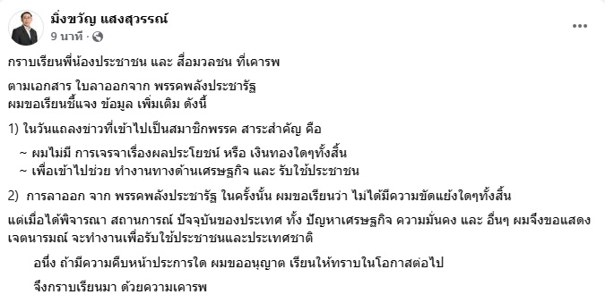 14 ตุลาคม 2568 นายมิ่งขวัญ แสงสุวรรณ์ อดีตสมาชิกพรรคพลังประชารัฐ (พปชร.) โพสต์ข้อความผ่านเฟซบุ๊ก ชี้แจงถึงสาเหตุของการลาออกจากสมาชิกพรรค พปชร. (อ่านข่าวที่เกี่ยวข้อง : ด่วน! ก้นหม้อไม่ทันดำ 'มิ่งขวัญ'ลาออกพปชร. ปิดเส้นทางฝัน 22 วัน) ดังนี้