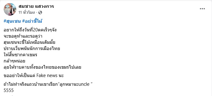 15 ตุลาคม 2568 นายสมชาย แสวงการ อดีตสมาชิกวุฒิสภา(อดีต สว.) โพสต์เฟซบุ๊กกรณีโลกโซเชียลมีการแชร์คำพูดของ ฮุน เซน ที่คุยโวว่าได้สั่งตำรวจบุกทำลายเว็บพนันของนักการเมืองไทยที่อยู่ในปอยเปตทันที ถ้า 20 ต.ค.นี้ ไทยไม่ยอมเปิดด่าน ระบุว่า...