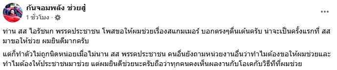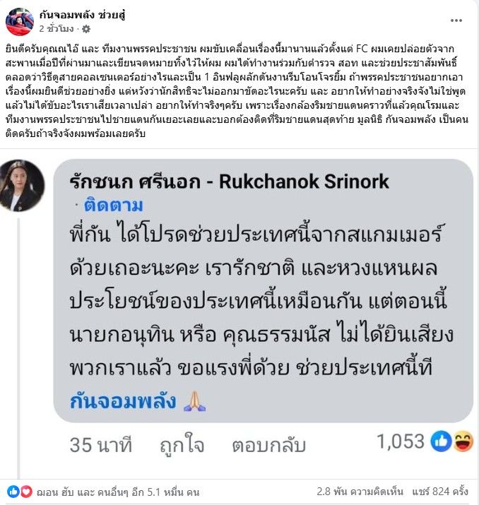จากนั้น กัน จอมพลัง ได้แคปคอมเมนต์ของ น.ส.รักชนก พร้อมกับโพสต์ ระบุว่า "ยินดีครับคุณณไอ๊ และ ทีมงานพรรคประชาชน ผมขับเคลื่อนเรื่องนี้มานานแล้วตั้งแต่ FC ผมเคยปล่อยตัวจากสะพานเมื่อปีที่ผ่านมาและเขียนจดหมายทิ้งไว้ให้ผม ผมได้ทำงานร่วมกับตำรวจ สอท และช่วยประชาสัมพันธิ์ตลอดว่าวิธีดูสายคอลเซนเตอร์อย่างไรและเป็น 1 อินฟลูผลักดันงานรีบโอนโจรยิ้ม ถ้าพรรคประชาชนอยากเอาเรื่องนี้ผมยินดีช่วยอย่างยิ่ง แต่หวังว่านักสิทธิจะไม่ออกมาขัดอะไรนะครับ และ อยากให้ทำอย่างจริงจังไม่ใช่พูดแล้วไม่ได้ขับอะไรเราเสียเวลาเปล่า อยากให้ทำจริงๆครับ เพราะเรื่องกล้องริมชายแดนคราวที่แล้วคุณโรมและทีมงานพรรคประชาชนไปชายแดนกันเยอะเลยและบอกต้องติดที่ริมชายแดนสุดท้าย มูลนิธิ กันจอมพลัง เป็นคนติดครับถ้าจริงจังผมพร้อมเลยครับ"