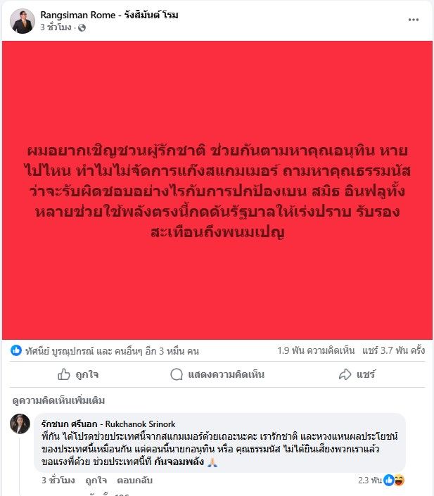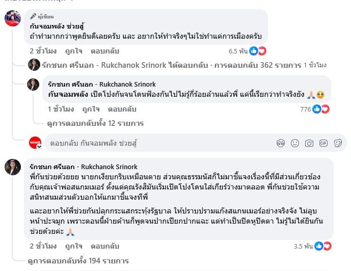 โดย น.ส.รักชนก ได้คอมเมนต์ใต้โพสต์เพิ่มเติมว่า "พี่กันช่วยด้วยยย นายกเงียบกริบเหมือนตาย ส่วนคุณธรรมนัสก็ไม่มาชี้แจงเรื่องนี้ที่มีส่วนเกี่ยวข้องกับคุณเจ้าพ่อสแกมเมอร์ ตั้งแต่คุณรังสิมันเริ่มเปิดโปงโดนใส่เกียร์ว่างมาตลอด พี่กันช่วยใช้ความสนิทสนมส่วนตัวบอกให้แกมาชี้แจงทีพี่ และอยากให้พี่ช่วยกันปลุกกระแสกระทุ้งรัฐบาล ให้ปราบปรามแก๊งสแกนเมอร์อย่างจริงจัง ไม่ลูบหน้าปะจมูก เพราะตอนนี้ฝ่ายค้านก็พูดจนปากเปียกปากแฉะ แต่ทำเป็นปิดหูปิดตา ไม่รู้ไม่ได้ยินกัน ช่วยด้วยค่ะ"