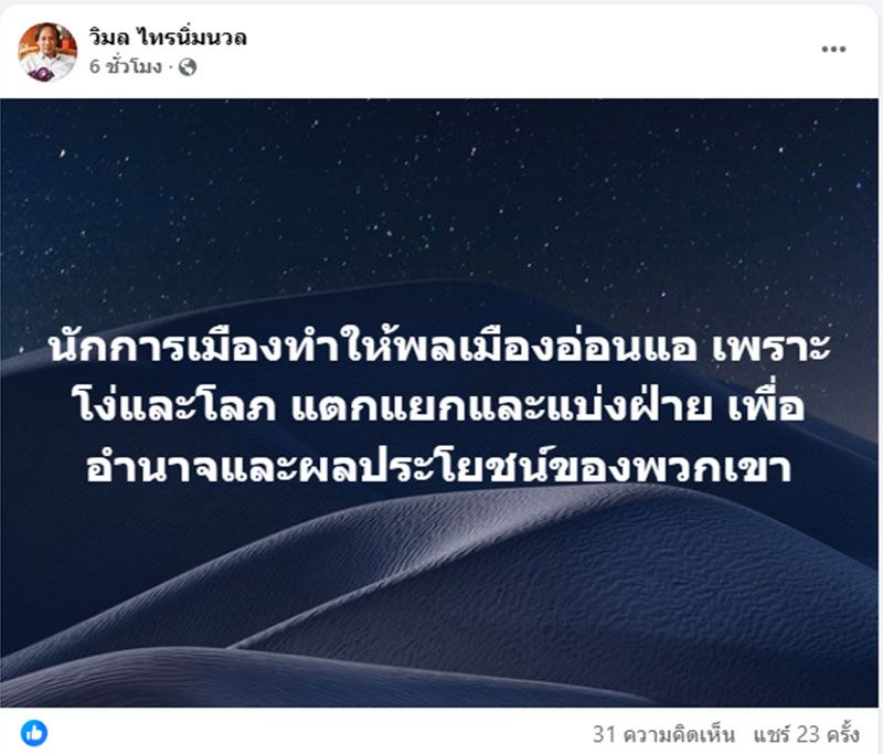 วันที่ 15 ตุลาคม 2568 วิมล ไทรนิ่มนวล นักเขียนรางวัลซีไรต์ โพสต์ข้อความผ่านเฟซบุ๊ก ระบุว่า นักการเมืองทำให้พลเมืองอ่อนแอ เพราะโง่และโลภ แตกแยกและแบ่งฝ่าย เพื่ออำนาจและผลประโยชน์ของพวกเขา