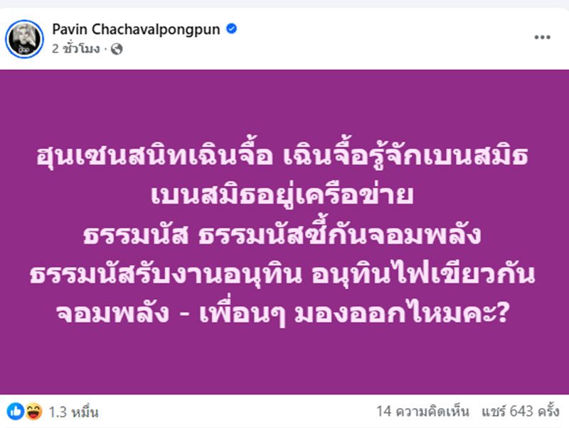 วันที่ 15 ตุลาคม นายปวิน ชัชวาลพงศ์พันธ์ อาจารย์สถาบันเอเชียตะวันออกเฉียงใต้ศึกษา ม.เกียวโต โพสต์ผ่านเฟซบุ๊ก Pavin Chachavalpongpun พยายามโยงนายเบน สมิธ กับบุคคลต่างๆ โดยระบุว่า "ฮุนเซนสนิทเฉินจื้อ เฉินจื้อรู้จักเบนสมิธ เบนสมิธอยู่เครือข่าย ธรรมนัส ธรรมนัสซี้กันจอมพลัง ธรรมนัสรับงานอนุทิน อนุทินไฟเขียวกันจอมพลัง - เพื่อนๆ มองออกไหมคะ?"