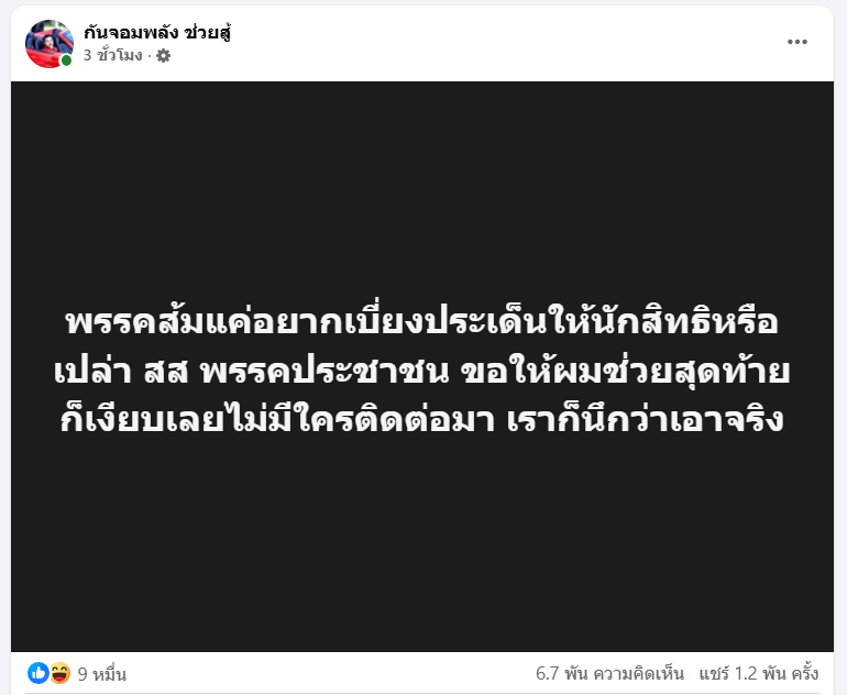 15 ต.ค.68 กัน จอมพลัง โพสต์ข้อความระบุว่า " พรรคส้มแค่อยากเบี่ยงประเด็นให้นักสิทธิหรือเปล่า สส พรรคประชาชน ขอให้ผมช่วยสุดท้ายก็เงียบเลยไม่มีใครติดต่อมา เราก็นึกว่าเอาจริง "
