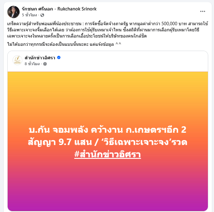 โดย ไอซ์ รัชนก ระบุว่า "เกร็ดความรู้สำหรับพ่อแม่พี่น้องประชาชน : การจัดซื้อจัดจ้างภาครัฐ หากมูลค่าต่ำกว่า 500,000 บาท สามารถใช้วิธีเฉพาะเจาะจงจิ้มเลือกได้เลย ว่าต้องการใช้ผู้รับเหมาเจ้าไหน ซึ่งสถิติที่ผ่านมาการเลือกผู้รับเหมาโดยวิธีเฉพาะเจาะจงในหลายครั้งเป็นการเลือกเอื้อประโยชน์ให้บริษัทของคนใกล้ชิด ไม่ได้บอกว่าทุกกรณีจะต้องเป็นแบบนั้นนะคะ แค่แจ้งข้อมูล"
