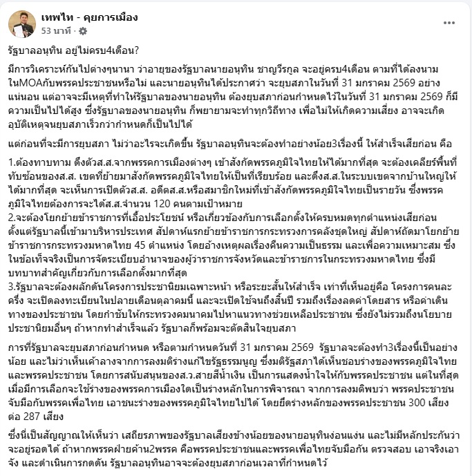 มีการวิเคราะห์กันไปต่างๆนานา ว่าอายุของรัฐบาลนายอนุทิน ชาญวีรกูล จะอยู่ครบ4เดือน ตามที่ได้ลงนามในMOAกับพรรคประชาชนหรือไม่ และนายอนุทินได้ประกาศว่า จะยุบสภาในวันที่ 31 มกราคม 2569 อย่างแน่นอน แต่อาจจะมีเหตุที่ทำให้รัฐบาลของนายอนุทิน ต้องยุบสภาก่อนกำหนดไว้ในวันที่ 31 มกราคม 2569 ก็มีความเป็นไปได้สูง ซึ่งรัฐบาลของนายอนุทิน ก็พยายามจะทำทุกวิถีทาง เพื่อไม่ให้เกิดความเสี่ยง อาจจะเกิดอุบัติเหตุจนยุบสภาเร็วกว่ากำหนดก็เป็นไปได้