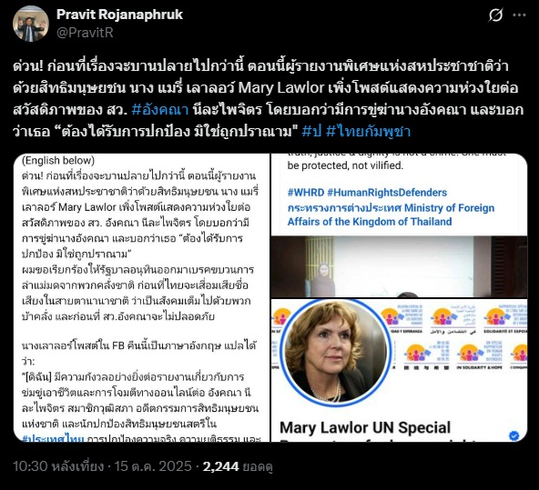 16 ตุลาคม 2568 นายประวิตร โรจนพฤกษ์ ผู้สื่อข่าวข่าวสดภาคภาษาอังกฤษ เจ้าของฉายา “นักข่าวเทวดา” โพสต์ข้อความใน X ระบุว่า “ด่วน! ก่อนที่เรื่องจะบานปลายไปกว่านี้ ตอนนี้ผู้รายงานพิเศษแห่งสหประชาชาติว่าด้วยสิทธิมนุษยชน นางแมรี่ เลาลอว์ Mary Lawlor เพิ่งโพสต์แสดงความห่วงใยต่อสวัสดิภาพของ สว.อังคณา นีละไพจิตร โดยบอกว่ามีการขู่ฆ่านางอังคณา และบอกว่าเธอ “ต้องได้รับการปกป้อง มิใช่ถูกประณาม”