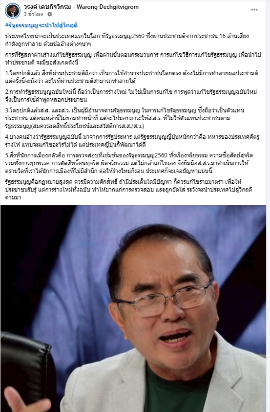 นพ.วรงค์ ระบุว่า ประเทศไทยน่าจะเป็นประเทศแรกในโลก ที่รัฐธรรมนูญ2560 ซึ่งผ่านประชามติจากประชาชน 16 ล้านเสียง กำลังถูกทำลาย ด้วยข้ออ้างต่างๆนาๆ