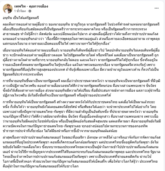 17 ตุลาคม 2568 นายเทพไท เสนพงศ์ อดีต สส.นครศรีธรรมราช โพสต์ข้อความผ่านเฟซบุ๊ก “เทพไท – คุยการเมือง” หัวข้อ “อนุทิน เป็นได้แค่รัฐมนตรี” ระบุว่า...