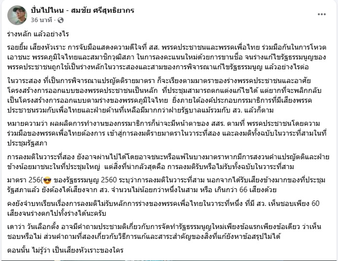 รอยยิ้ม เสียงหัวเราะ การจับมือแสดงความดีใจที่ สส. พรรคประชาชนและพรรคเพื่อไทย ร่วมมือกันในการโหวตเอาชนะ พรรคภูมิใจไทยและสมาชิกวุฒิสภา ในการลงคะแนนใหม่ด้วยการขานชื่อ จนร่างแก้ไขรัฐธรรมนูญของพรรคประชาชนถูกใช้เป็นร่างหลักในวาระสองและสามของการพิจารณาแก้ไขรัฐธรรมนูญ แล้วอย่างไรต่อ
