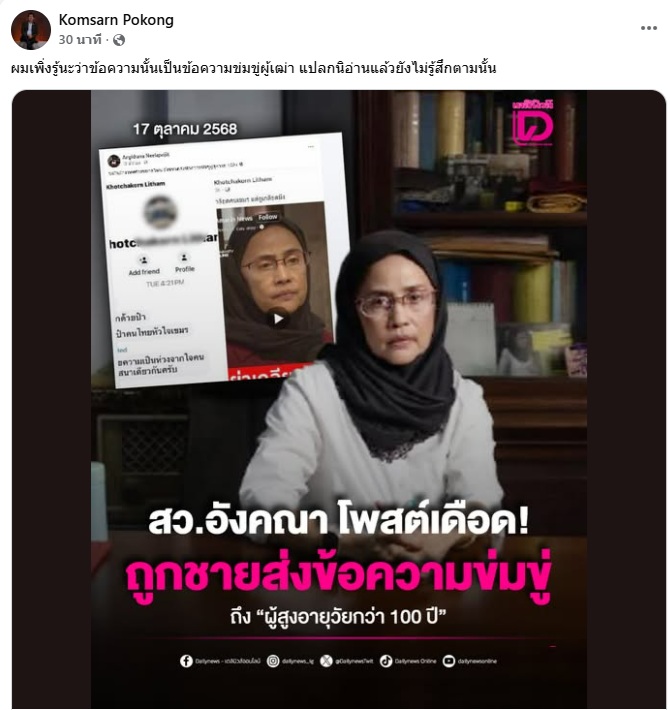 ในโพสต์ดังกล่าวนายคมสัน ได้แชร์ภาพข่าวที่นางอังคณา นีละไพจิตร สว. ออกมาระบุว่ามีคนข่มขู่โดยส่งข้อความว่า “จิตใจต้องโหดร้ายขนาดไหน ถึงขนาดส่งข้อความข่มขู่ผู้สูงอายุ 100+ ปี” มาประกอบด้วย (อ่านข่าวที่เกี่ยวข้อง : ใจทำด้วยอะไร! 'อังคณา'รับไม่ได้ มีคนส่งข้อความหาพ่อ ข่มขู่ผู้สูงอายุ 100+ ปี)