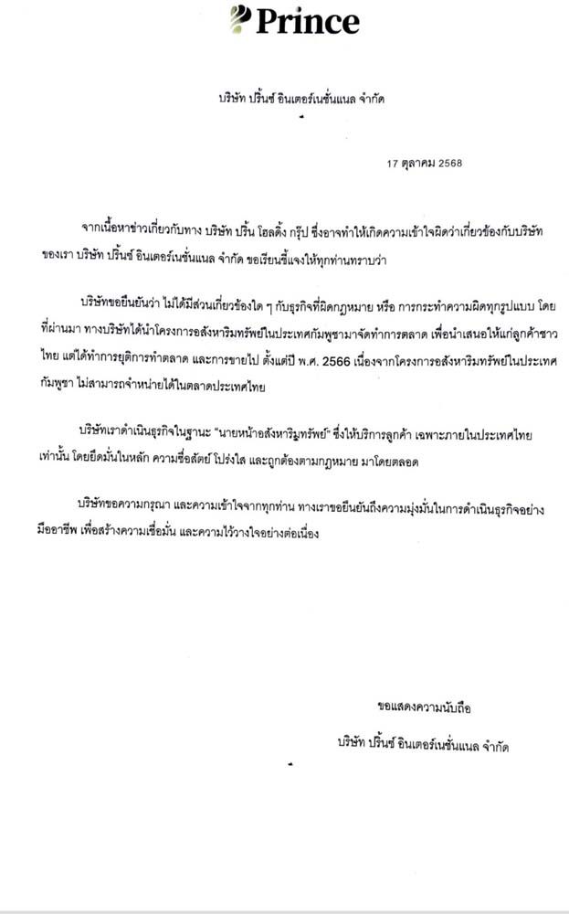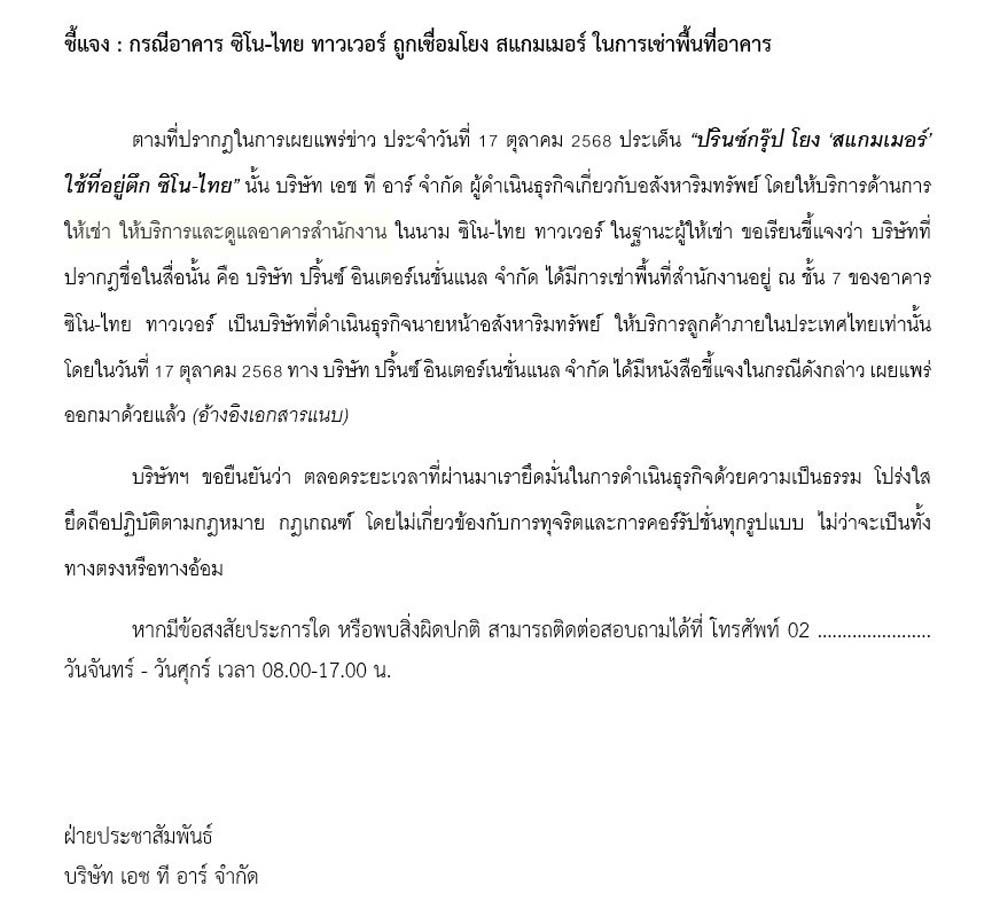 บริษัท เอช ที อาร์ จำกัด ผู้ดำเนินธุรกิจเกี่ยวกับอสังหาริมทรัพย์ โดยให้บริการด้านการให้เช่า ให้บริการและดูแลอาคารสำนักงาน ในนาม ซิโนไทย ทาวเวอร์ ในฐานะผู้ให้เช่า ขอเรียนชี้แจงว่า บริษัทที่ปรากฏชื่อในสื่อนั้น คือ บริษัทปริ้นซ์ อินเตอร์เนชั่นแนล จำกัด ได้มีการเช่าพื้นที่สำนักงานอยู่ ณ ชั้น 7 ของอาคาร ซิโน-ไทย ทาวเวอร์ เป็นบริษัทที่ดำเนินธุรกิจนายหน้าอสังหาริมทรัพย์ ให้บริการลูกค้าภายในประเทศไทยเท่านั้นโดยในวันที่ 17 ตุลาคม 2568 ทางบริษัท ปริ้นซ์ อินเตอร์เนชั่นแนล จำกัด ได้มีหนังสือชี้แจงในกรณีดังกล่าว เผยแพร่ออกมาด้วยแล้ว