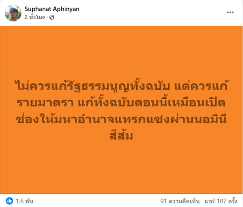 วันที่ 17 ตุลาคม 2568 ดร.ศุภณัฐ อภิญญาณ หรือ “ดร.นิว” นักวิจัยภายใต้สถาบันวิจัย MAST Center และ คณะวิศวกรรมชีวการแพทย์ University of Arkansas ประเทศสหรัฐอเมริกา โพสต์เฟซบุ๊ก Suphanat Aphinyan ว่า "ไม่ควรแก้รัฐธรรมนูญทั้งฉบับ แต่ควรแก้รายมาตรา แก้ทั้งฉบับตอนนี้เหมือนเปิดช่องให้มหาอำนาจแทรกแซงผ่านนอมินีสีส้ม"