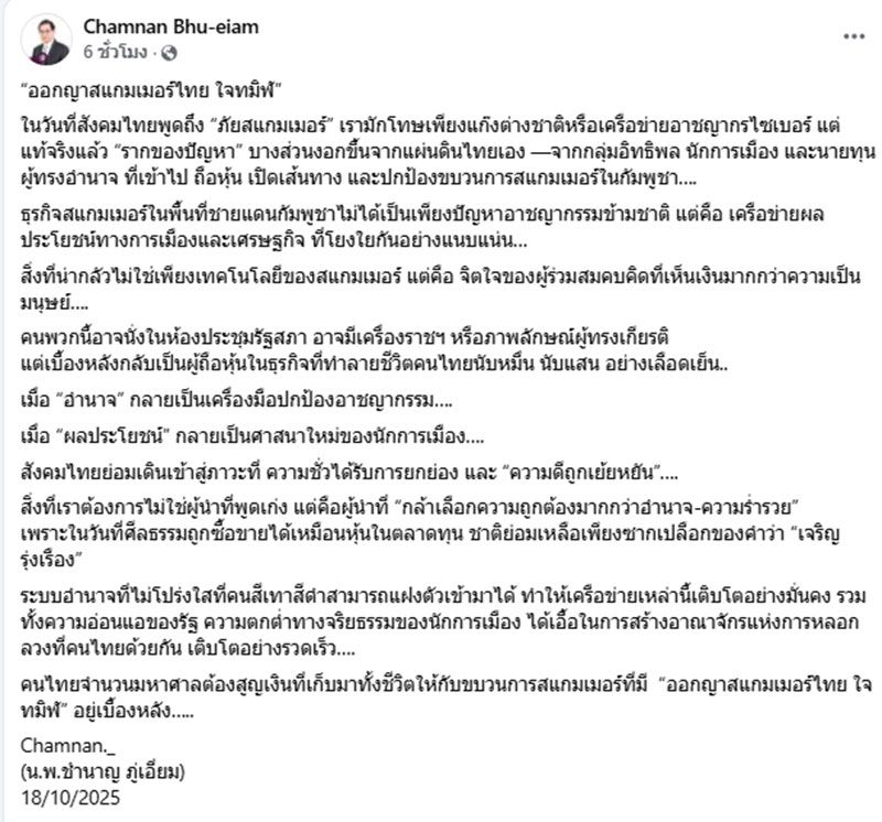 วันที่ 12 กันยายน 2568 นพ.ชำนาญ ภู่เอี่ยม อดีตหัวหน้าผู้ตรวจราชการกระทรวงสาธารณสุข โพสต์ความเห็นผ่านเฟซบุ๊กส่วนตัว Chamnan Bhu-eiam ระบุว่า “ออกญาสแกมเมอร์ไทย ใจทมิฬ”