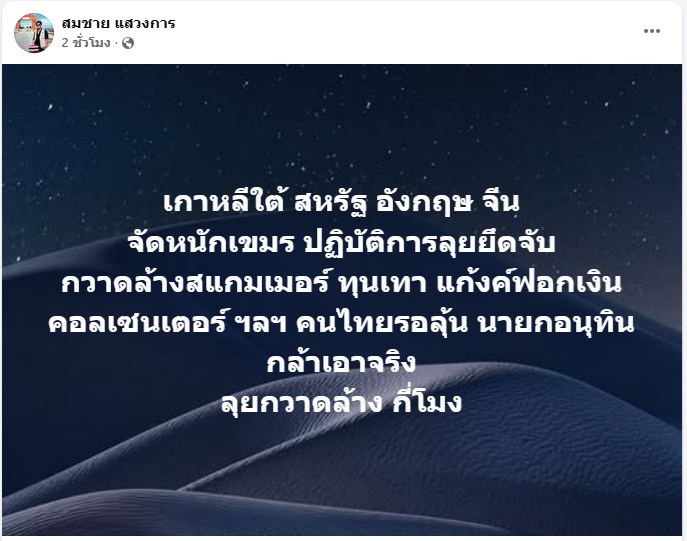 19 ตุลาคม 2568 นายสมชาย แสวงการ อดีตสมาชิกวุฒิสภา (อดีต สว.) โพสต์ข้อความลงบนเฟซบุ๊ก ระบุว่า “เกาหลีใต้ สหรัฐ อังกฤษ จีน จัดหนักเขมร ปฏิบัติการลุยยึดจับ กวาดล้างสแกมเมอร์ ทุนเทา แก๊งฟอกเงิน คอลเซนเตอร์ ฯลฯ คนไทยรอลุ้น นายกอนุทิน กล้าเอาจริง ลุยกวาดล้าง กี่โมง”