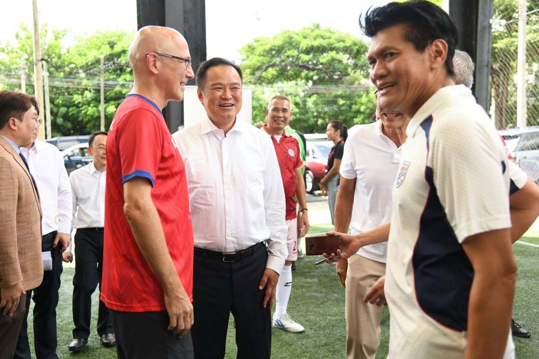 ผู้สื่อข่าวรายงานอีกว่า ภายหลังนายอนุทิน กล่าวเปิดงานเสร็จสิ้นนายอนุทิน ได้เดินไปทักทายนายอภิสิทธิ์ ที่มาร่วมกิจกรรมเตะฟุตบอลด้วยในวันนี้ โดยนายอนุทิน กล่าวแสดงความยินดีกับนายภิสิทธิ์ที่ได้รับตำแหน่งหัวหน้าพรรคประชาธิปัตย์ ก่อนที่นายอนุทินจะแนะนำ นายพัฒนา พร้อมพัฒน์ รมว.สาธารณสุข ให้รู้จักกับ นายสาธิต ปิตุเตชะ อดีตรมช.สาธารณสุข ที่เคยร่วมงานกัน นอกจากนี้ นายอนุทินยังได้พูดคุยกับนายอภิสิทธิ์เรื่องทีมฟุตบอลที่จะมีการแข่งขันกันระหว่างทีมลิเวอร์พูลกับแมนเชสเตอร์ยูไนเต็ด ในช่วงคืนวันนี้ ก่อนที่นายอนุทินจะชวนนายอภิสิทธิ์เข้าไปยังสนามแตะบอล โดยนายอนุทินไม่ได้ลงไปร่วมเตะบอลในสนามด้วย เพียงนั่งเชียร์อยู่ขอบสนาม มีเพียงนายอภิสิทธิ์และนายสาธิตที่ลงไปเตะบอลในสนาม