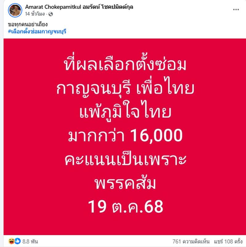 “ที่ผลเลือกตั้งซ่อมกาญจนบุรี เพื่อไทยแพ้ภูมิใจไทย มากกว่า 16,000 คะแนน เป็นเพราะพรรคส้ม 19 ต.ค.68”