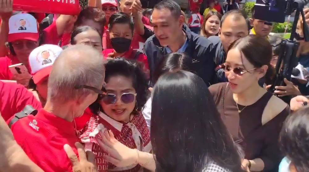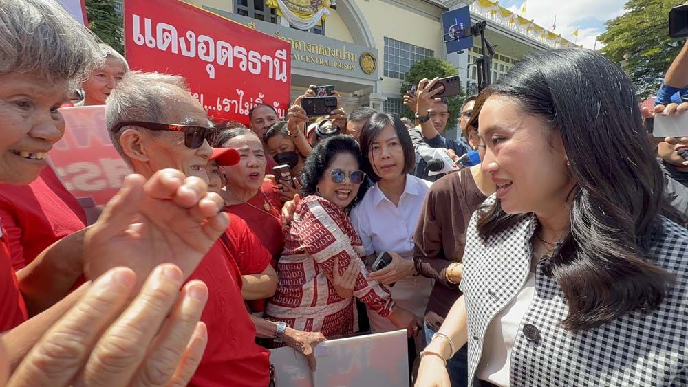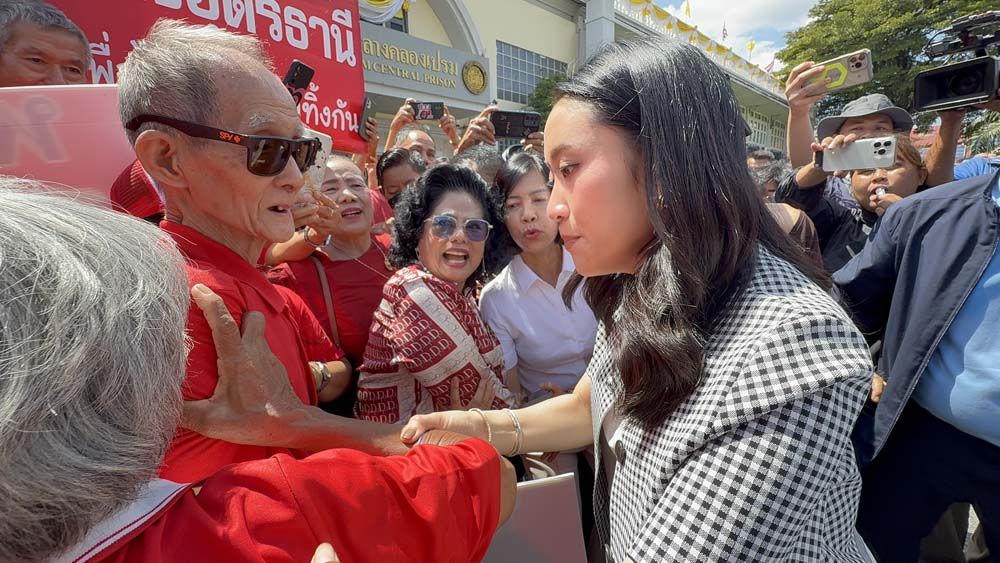 ต่อจากนั้น ทั้งคู่ก็ได้เดินไปพูดคุยทักทายและจับไม้จับมือกลุ่มคนเสื้อแดงที่ปักหลักรอให้กำลังใจ นอกจากนี้ พบว่ามีคนเสื้อแดงได้ยื่นแก้วพลาสติกที่ด้านในมีมะม่วงหาวมะนาวโห่ มอบให้กับ น.ส.แพทองธาร ซึ่ง น.ส.พินทองทา ได้เป็นผู้รับมอบไว้แทนและยื่นให้กับทีมงานที่ติดตามมาเก็บเอาไว้ ก่อนขึ้นรถเดินทางกลับออกจากพื้นที่เรือนจำฯ โดยมีมวลชนคนเสื้อแดงคอยส่งเสียงตะโกนว่า “นายกสู้ ๆ“
